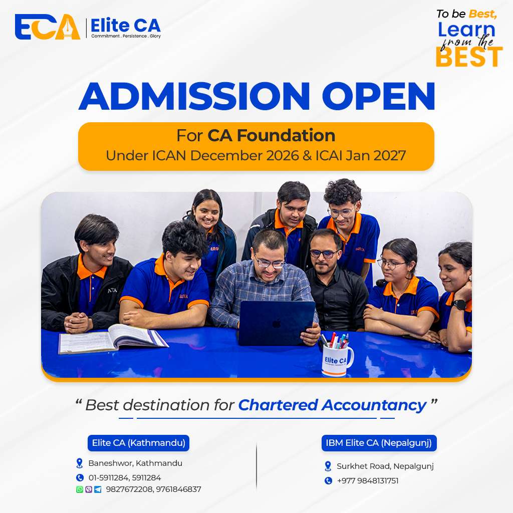 Elite CA, the best CA institute in Nepal, operated and managed by highly experienced, qualified and renowned Chartered Accountants, offers specialized professional classes for aspiring students pursuing Chartered Accountancy course under The Institute of Chartered Accountants of Nepal (ICAN) and The Institute of Chartered Accountants of India (ICAI). Elite CA helps students to have better preparation for all levels of CA course in Nepal. We offer a perfect blend of experience and knowledge that helps groom our students to successfully complete the CA in Nepal. Our faculties have decades of experience in the CA teaching field and have successfully guided thousands of students towards achieving their aim of becoming a CA. You can be assured that Elite CA will be an answer to all your questions and will provide the best environment to help shape your future.
